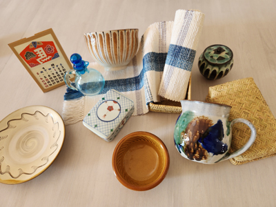 ・田村節子(作)のゆがオリジナル型染はがき/岩井小夜子・張り子